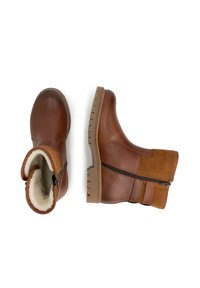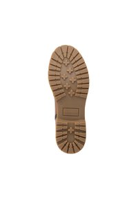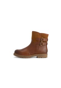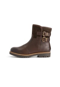 Bruine leren enkellaars met suède bovenrand, dubbele zijgespennen, profielzool en ronde neus, gericht naar links op een witte achtergrond.