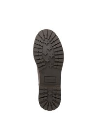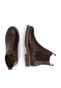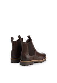 Bruine leren Chelsea-boot met elastische zijpanelen, trekbanden, gestructureerde zool en geperst logo op de hiel.