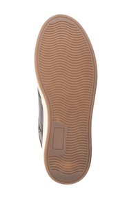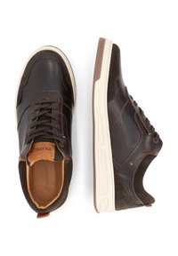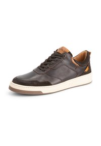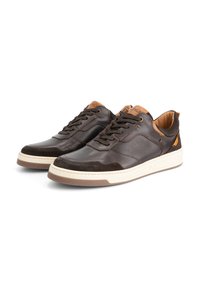 Heren sneaker van donkerbruin leer en suede met tan accenten en een witte zool, weergegeven in zijprofiel op een witte achtergrond.