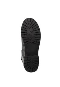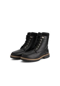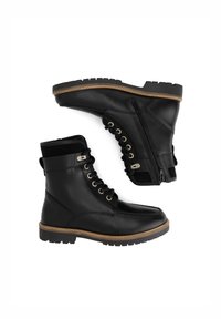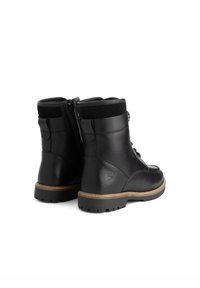Zwarte leren enkelboot met ronde neus, vetersluiting, metalen oogjes en een gestructureerde bovenkant. Voorzien van een rubberen zool en tan accenten.