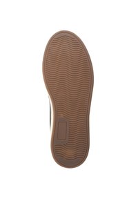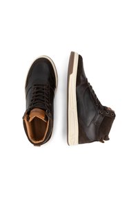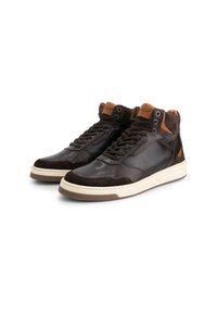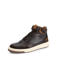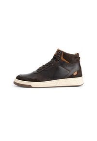 Bruine leren hoge sneaker met suède accenten, crème zool, gestructureerde afwerking en zwarte veters. Ontworpen met een gevoerde kraag en zijpaneel.