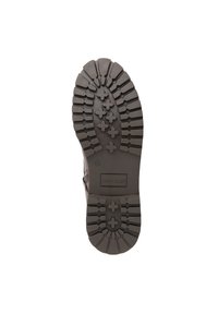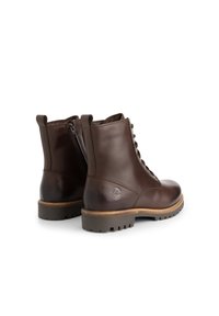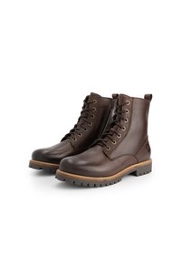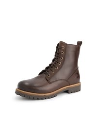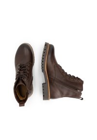 Bruine leren enkellaarsjes met een ronde neus, vetersluiting aan de voorkant, metalen oogjes en een gestructureerde rubberen zool. Decoratief logo aan de zijkant.