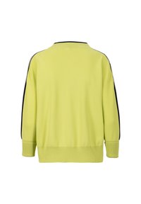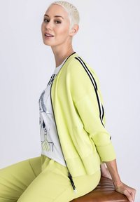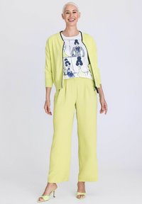 Lachend persoon met kort blond haar, gekleed in een lichtgele jas en broek, en een wit shirt met illustraties van vrouwen met zonnebrillen.