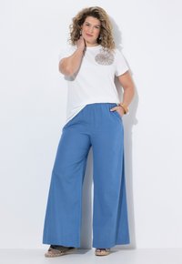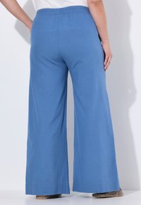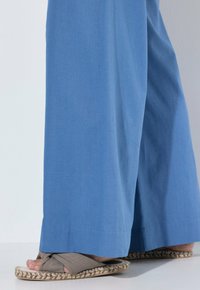 Blauwe wijde broek met elastische tailleband, zijzakken, gedragen met beige sandalen met open teen tegen een witte achtergrond.