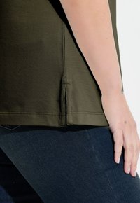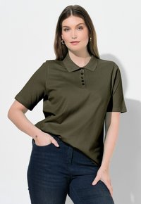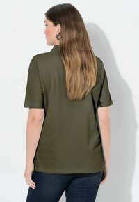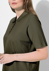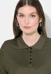 Vrouw met een lichte huid en bruin haar draagt een olijfgroene korte mouwen polo en donkere spijkerbroek, staand tegen een effen witte muur.