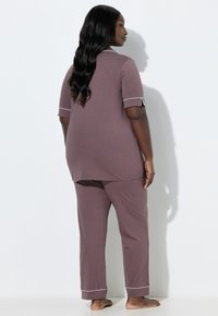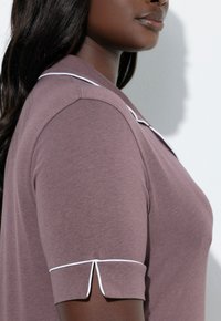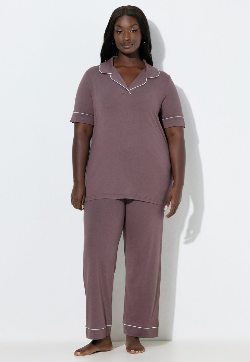 Zwarte vrouw staat blootsvoets en draagt een mauve pyjamaset met korte mouwen, afgewerkt met witte biezen op de kraag, manchetten en pijpzomen, tegen een witte achtergrond.