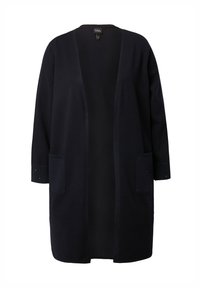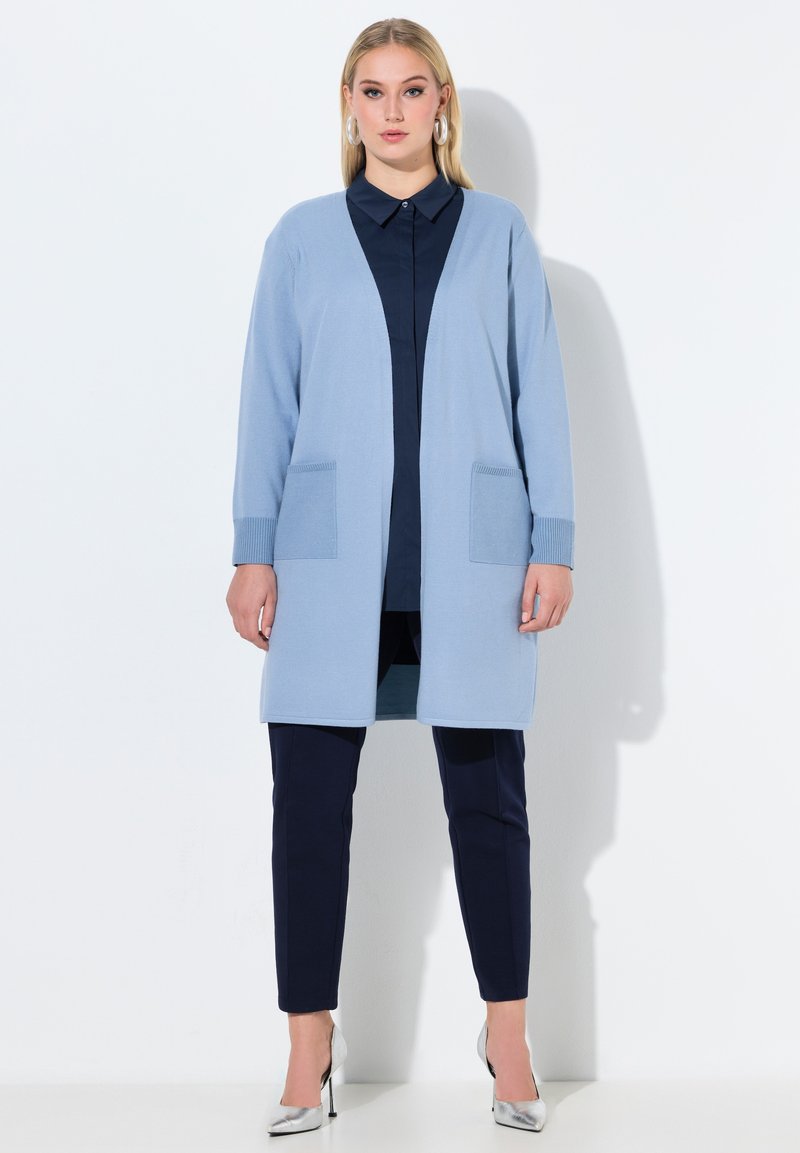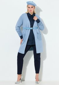 Vrouw die een lichtblauwe open cardigan, een marineblauw shirt, marineblauwe broek en zilveren hoge hakken draagt, staand tegen een witte achtergrond.