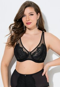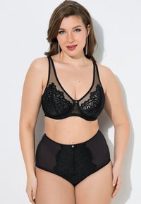 Vrouw met lang golvend haar, gekleed in een zwarte kanten beha en bijpassende hoge tailleonderbroek, poseert met de hand op de heup tegen een witte achtergrond.