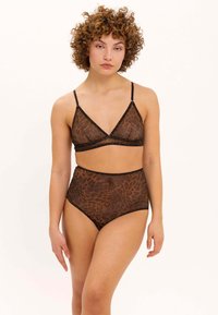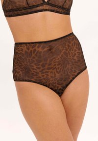 Vrouw draagt transparante, hooggetailleerde bruine ondergoed met luipaardprint en zwarte biezen tegen een witte achtergrond.