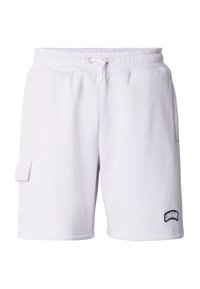 Man draagt zwarte cargoshorts met zijzak, witte sokken en zilverblauwe hardloopschoenen, staand tegen een effen grijze achtergrond.