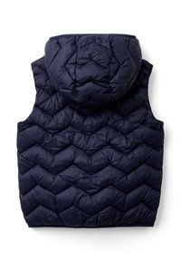 Marineblauwe gewatteerde mouwloze bodywarmer met een capuchon, voorzien van een centrale ritssluiting en een doorgestikte textuur. Glad stof met een zachte afwerking.