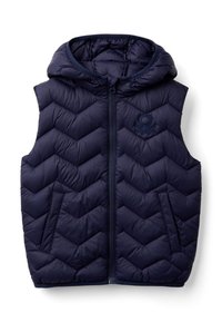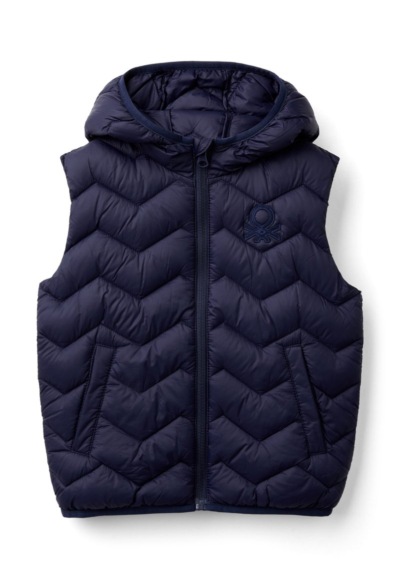 Marineblauwe gewatteerde mouwloze bodywarmer met ritssluiting aan de voorkant, capuchon, zijzakken en een geborduurd logo op de linkerborst.