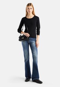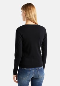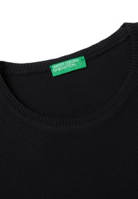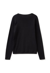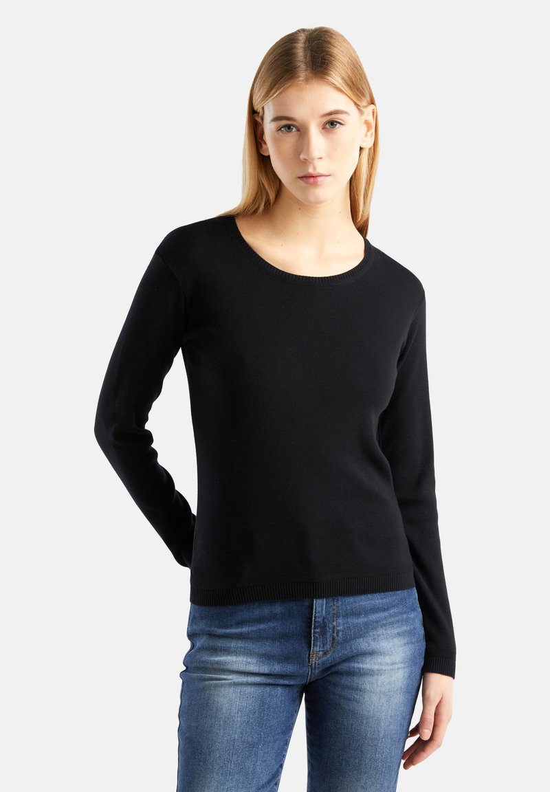 Zwarte trui met lange mouwen in ribbeltextuur, met een ronde halslijn en een aansluitende zoom, gedragen met lichtblauwe spijkerbroek.