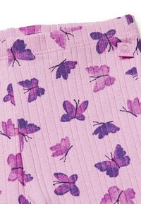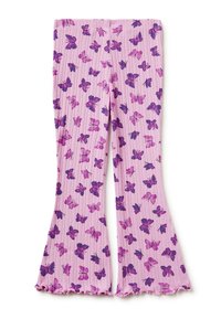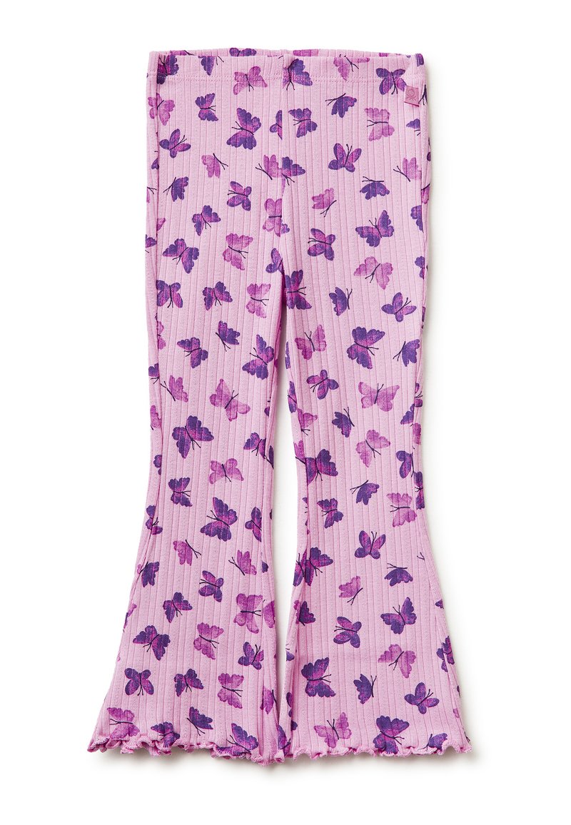 Roze geribbelde broek met wijde pijpen, bedrukt met donker- en lichtpaarse vlinders.