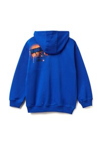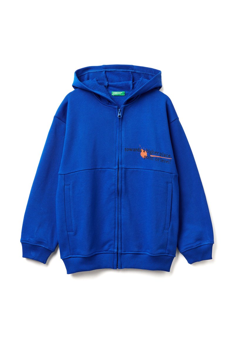 Blauwe zip-up hoodie, gemaakt van zachte stof, met een voorste kangoeroezak en tekstdetail in oranje aan de linkerkant.