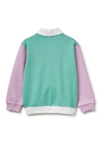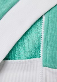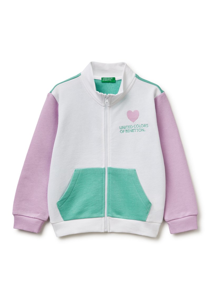 Witte jas met ritssluiting, roze mouwen, groene zakken aan de voorkant en een roze hart met de tekst "United Colors of Benetton" op de borst.