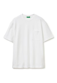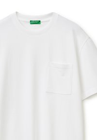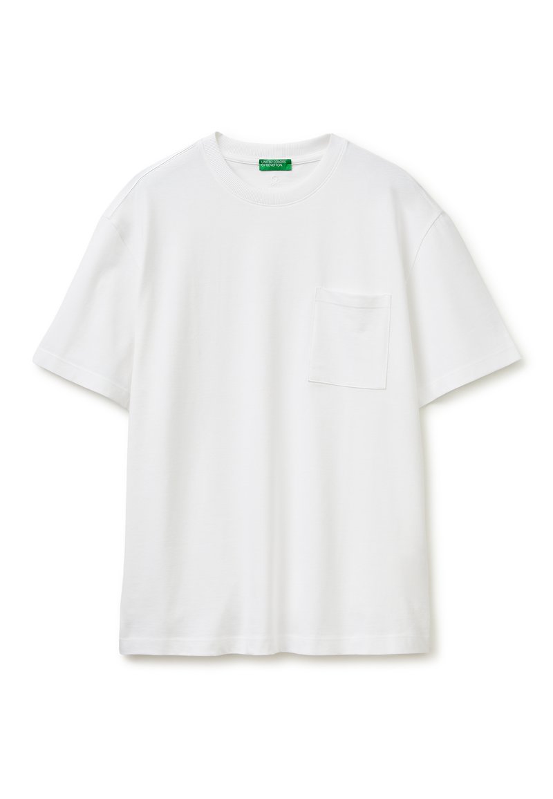 Eenvoudig wit T-shirt met korte mouwen, een ronde hals en een klein borstzakje aan de linkerkant.