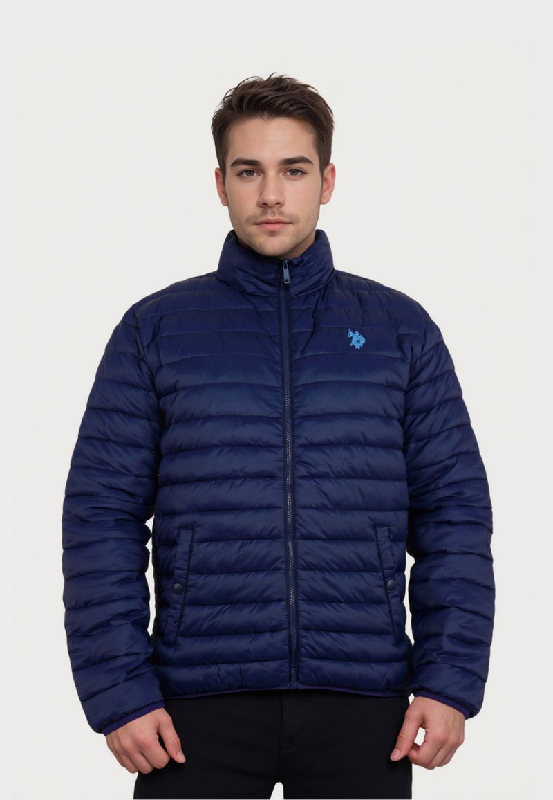 Jonge man die een donkerblauw doorgestikt jack met rits draagt, met een klein lichtblauw logo op de borst, staand tegen een effen achtergrond.