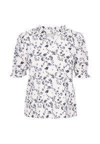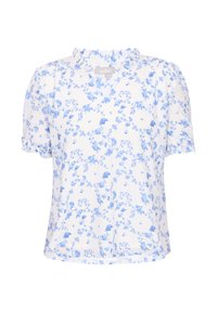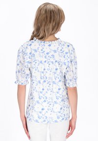 Vrouw met lang blond haar, gekleed in een wit overhemd met blauwe bloemenprint en een witte broek, staand tegen een witte achtergrond.