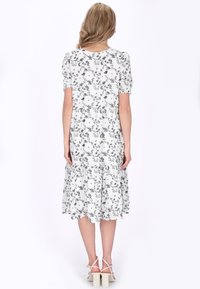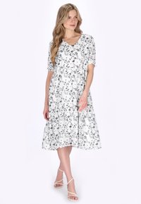 Jonge vrouw met lang blond haar, gekleed in een witte jurk met bloemenprint tot op de knie en witte sandalen met hakken, staand tegen een witte achtergrond.