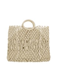 Beige geweven tas met een ronde handgreep, met ingewikkelde bloemmotieven en een open ontwerp, vervaardigd uit gestructureerde materialen.