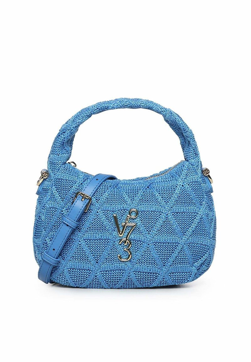 Blauwe handtas met een getextureerd, doorgestikt ruitpatroon, gebogen bovenhandvat, verstelbare band en zilveren V73-logo aan de voorkant.