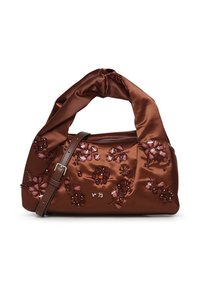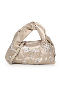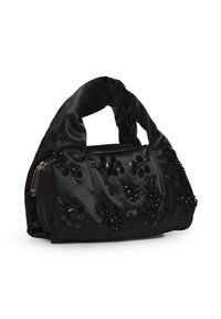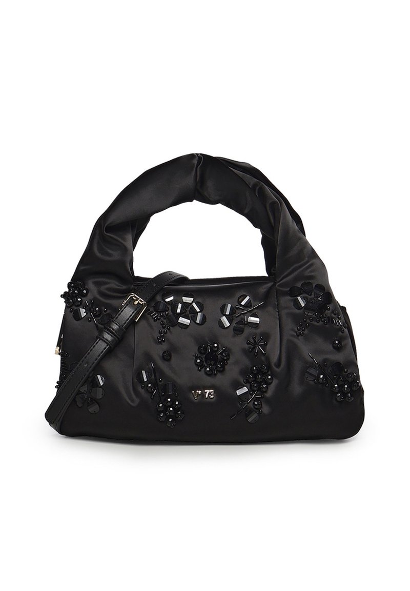 Zwarte satijnen handtas met gewatteerde handgreep, versierd met zwarte kralen in bloemmotief en een afneembare schouderriem.