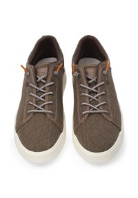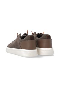 Deze bruine herenschoenen zijn vervaardigd uit textiel met een opvallende structuur en bieden comfort dankzij de leren versteviging bij de hiel. Het model heeft een klassieke ronde neus en een elastisch vetersysteem met metalen oogjes voor een optimale pasvorm. Een subtiel reliëflogo aan de zijkant en decoratieve stiksels die de lijn van de schacht benadrukken, geven deze schoenen een verfijnde uitstraling. De verhoogde en flexibele zool met subtiele groefstructuur zorgt voor een uitstekende grip en comfort.