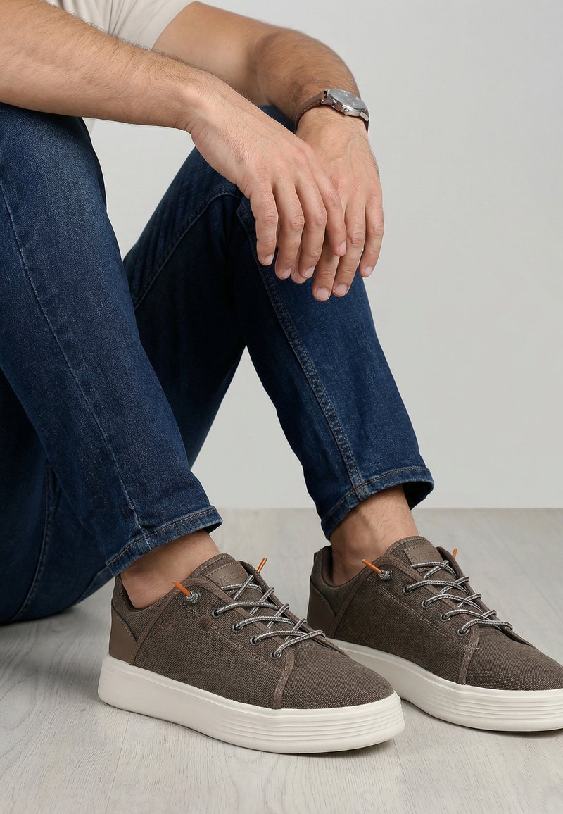 Man zit op de grond en draagt donkerblauwe spijkerbroek en bruine casual lage sneakers met witte zolen en veters.