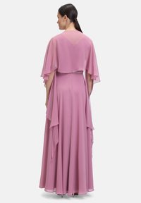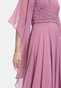 Lange roze chiffon jurk met een aansluitende taille, geplooide buste en vloeiende mouwen. Kenmerkt zich door een strass accent bij de taille.