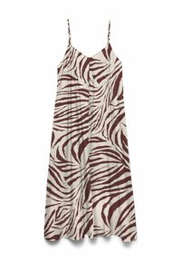 Midijurk met luipaardprint, dunne spaghettibandjes, vloeiende stof, v-hals en een ontspannen pasvorm, met een zwart en tan kleurenschema.