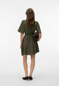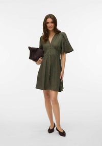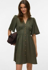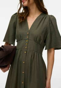 Vrouw draagt een olijfgroene jurk tot de knieën met knopen aan de voorkant en houdt een opgevouwen donker jasje in één hand.