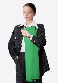 Nice vivid colour, like shown in the pics. The wool is soft, not itchy at all.