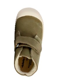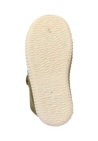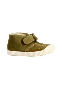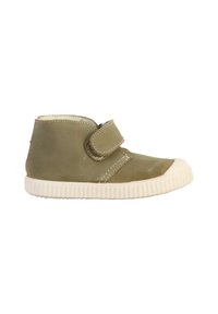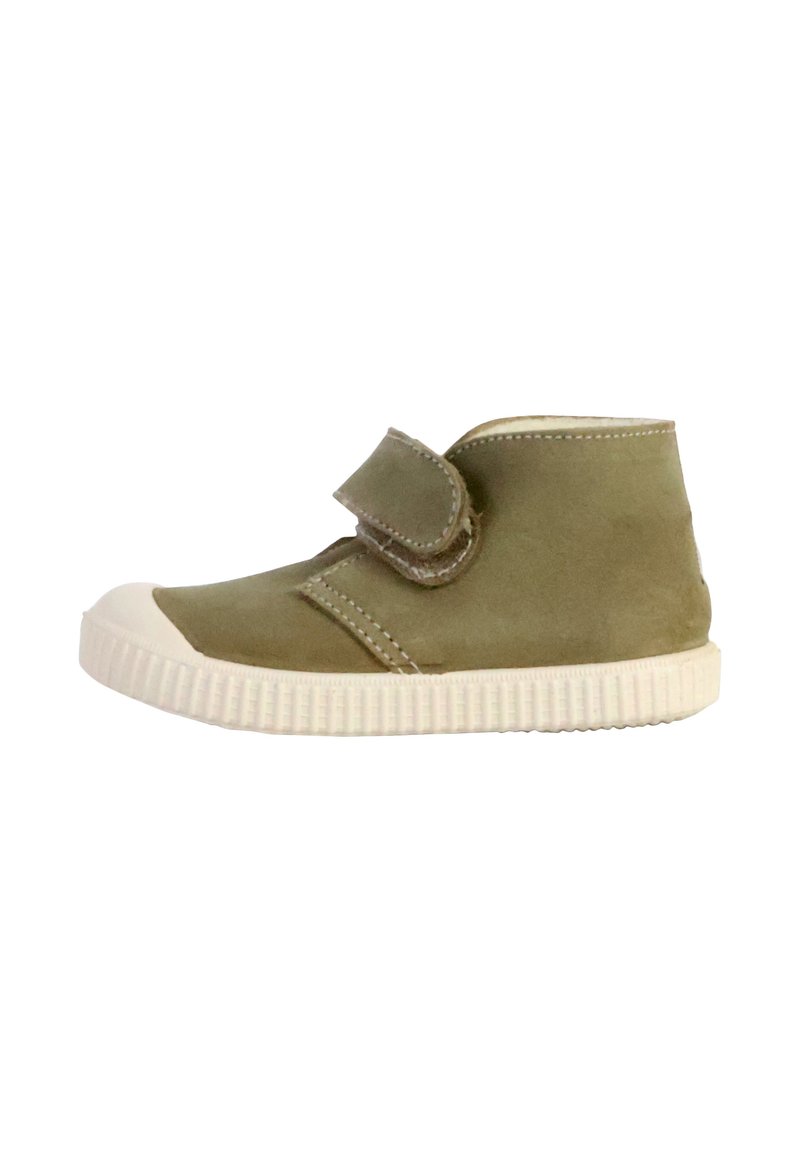 Groene suède enkellaars met witte rubberen neusstuk, klittenbandsluiting en een gestructureerde zool. Kenmerkt zich door gestikte accentlijnen.