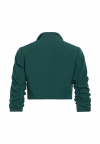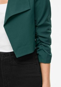 Vrouw draagt een kort donkergroen colbert over een wit topje en een zwarte broek met hoge taille, staand tegen een effen witte achtergrond.