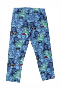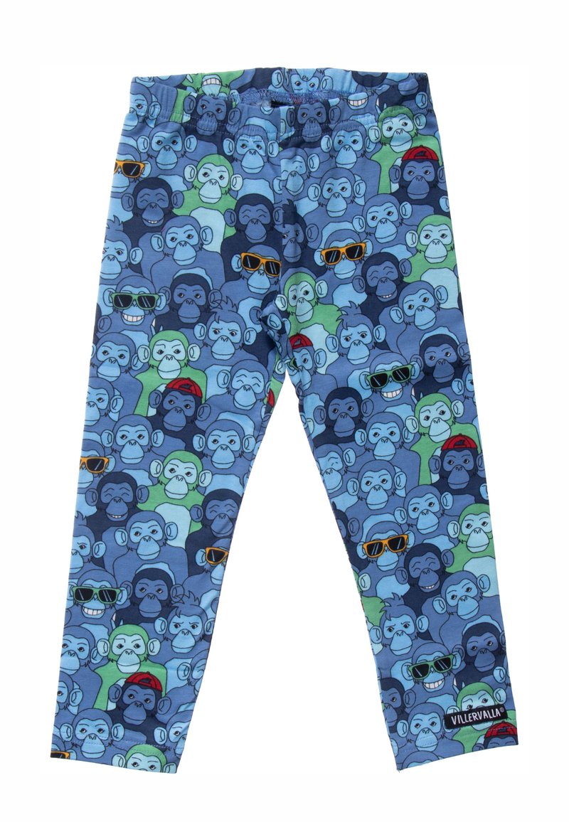 Kinderleggings met een kleurrijk patroon van tekenfilmapetjes die zonnebrillen, hoeden en mondmaskers dragen, op een blauwe en groene achtergrond.
