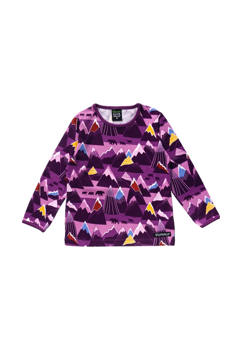 Lange mouw paars shirt voor kinderen met kleurrijke patronen van bergen en beren, ronde halslijn en VillerValla merklabel.