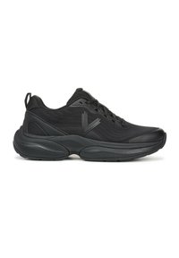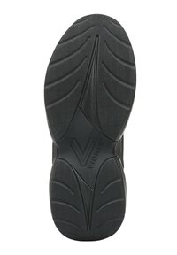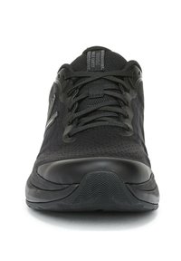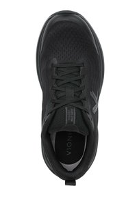 Zwarte sportschoen met een bovenwerk van mesh, een gestructureerd ontwerp, een dempende zool en een verstevigde neus. Veters en een trekkoord zijn inbegrepen.