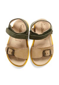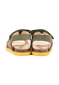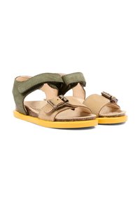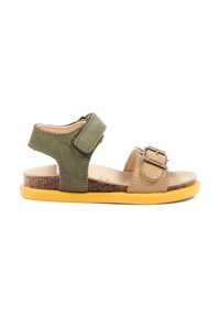 Open teen sandaal voor kinderen met beige voorriem en groene enkelriem, gele zool, kurken voetbed en verstelbare gesp- en klittenbandsluitingen.