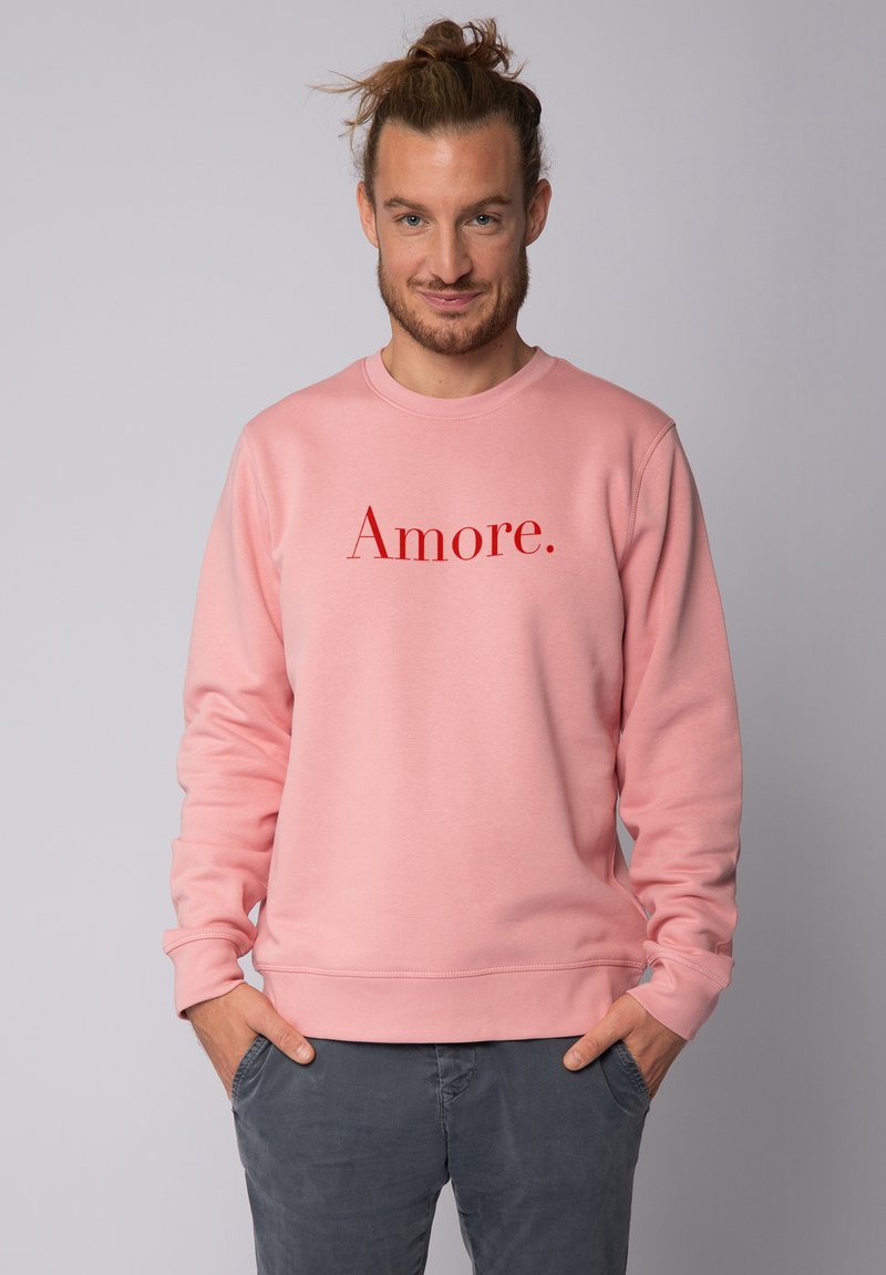 Lichtroze sweatshirt van zacht materiaal met het woord "Amore." in vetrode lettertype. Klassieke ronde hals en lange mouwen.