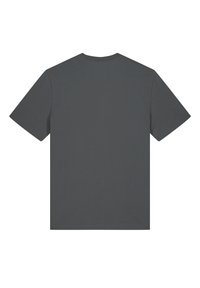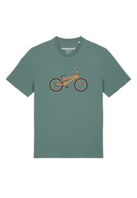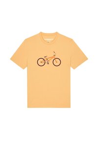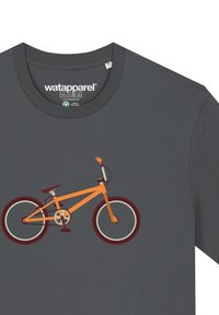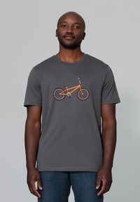 Grijs T-shirt met korte mouwen, voorzien van een grafisch ontwerp van een oranje fiets. De stof heeft een gladde textuur, met een ronde halslijn en een relaxte pasvorm.