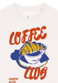 Witte katoenen t-shirt met een kleurrafische afbeelding van een croissant en een koffiekop met de tekst "COFFEE CLUB." Casual fit, korte mouwen.