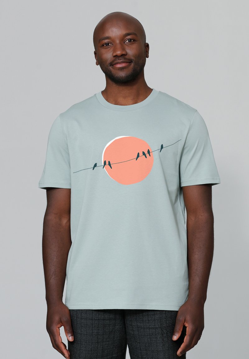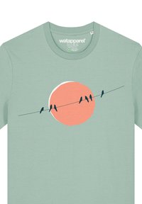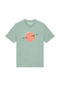 Muntgroene T-shirt met korte mouwen, voorzien van een grafisch ontwerp van vogels op een draad voor een perzikkleurige zon. Zacht katoenen materiaal, ontspannen pasvorm.
