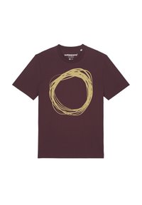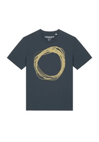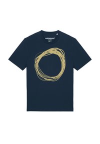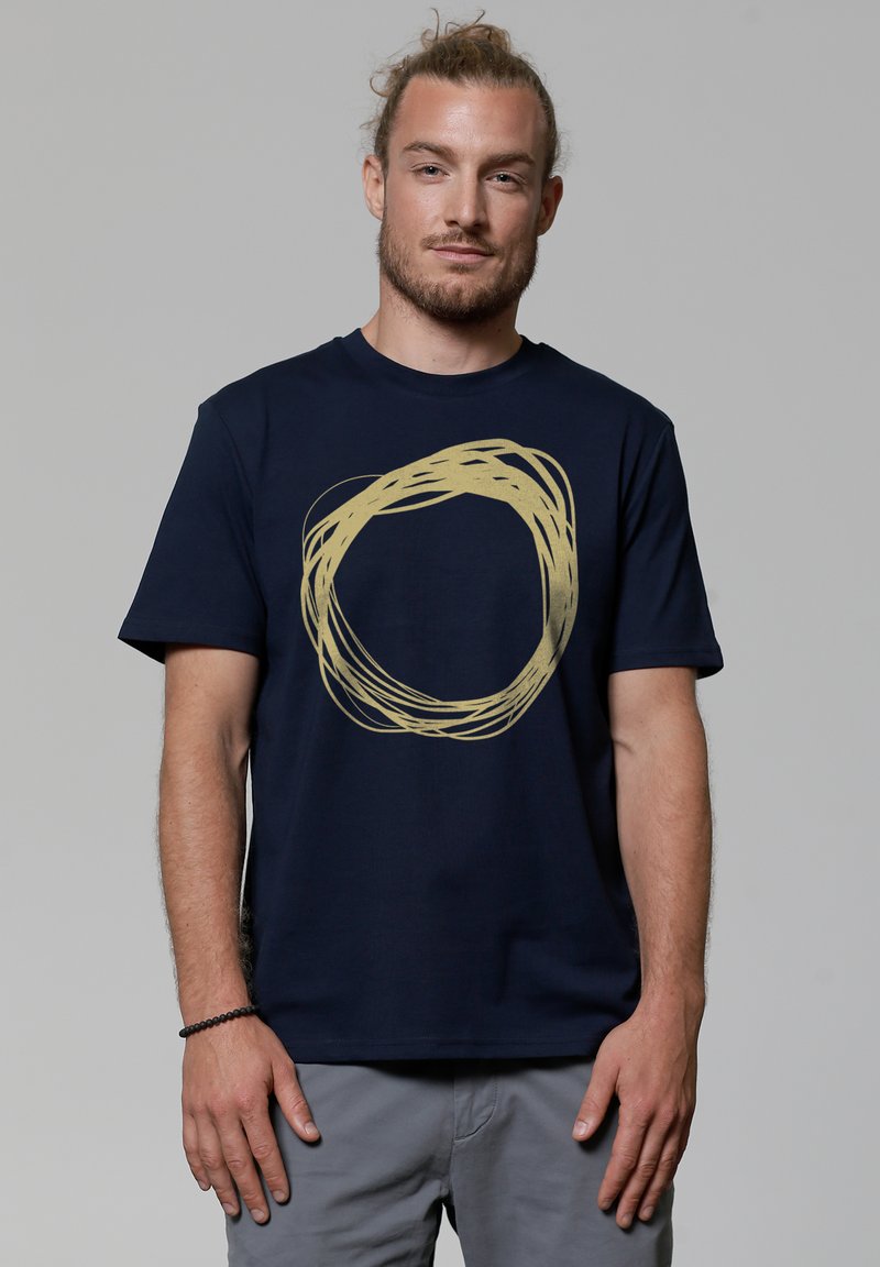 Marineblauwe katoenen t-shirt met een gouden ronde grafische print in het midden. Korte mouwen, ronde hals en een relaxte pasvorm.