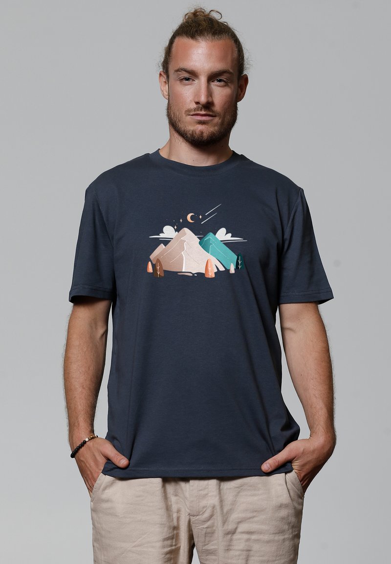 Navyblauwe katoenen T-shirt met een grafische afbeelding van bergen, bomen en wolken in pastelkleuren, ronde halslijn en korte mouwen.