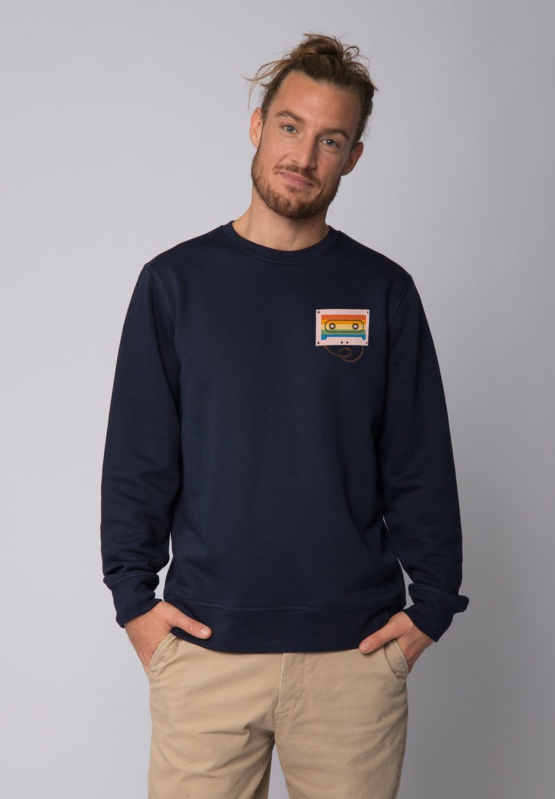 Marineblauwe sweatshirt met lange mouwen en ronde hals. Heeft een kleurrijke cassetteafbeelding op de borstzak. Zachte stofstructuur.