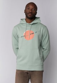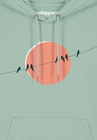 Mintgroene hoodie met een cirkelvormige perzikafbeelding en zwarte vogels op een draad ontwerp, met een zak aan de voorkant en een trekkoordkap.