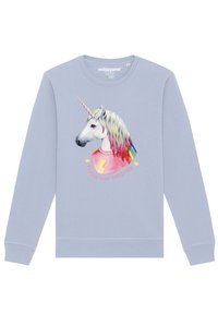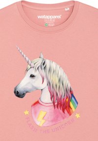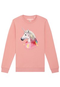 Roze sweatshirt met een eenhoorn afbeelding die een regenboog manen en bliksemschicht toont. Met ribbelboorden en zoom, van zacht katoen.