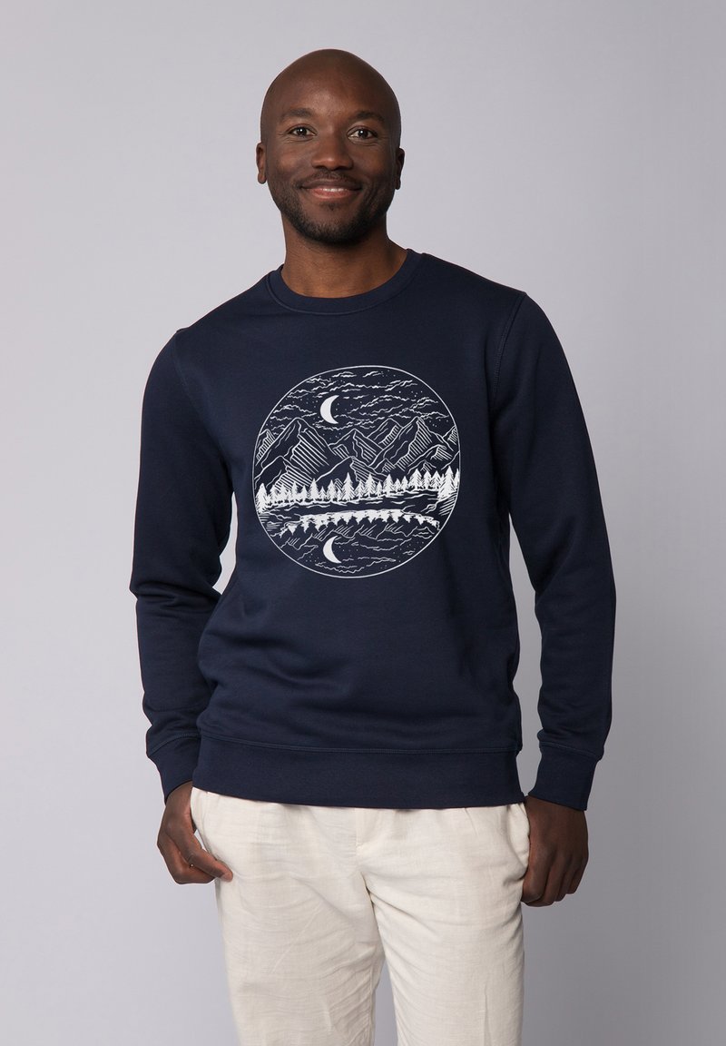 Marineblauwe sweatshirt met een cirkelvormige witte graphic van bergen, bomen en een waterlichaam, met een halve maan en een gestructureerde stof.