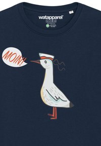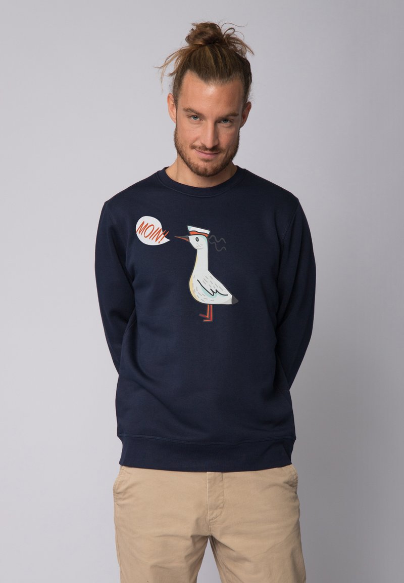 Navyblauwe sweatshirt met een witte zeevogelafbeelding met rode accenten en een spreekwolk met de tekst "MONN!" Zachte stof, ronde halsontwerp.